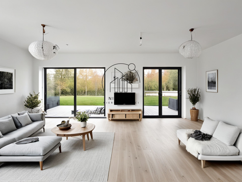 • przestronny salon z ogromnymi przeszkleniami i wyjściem na ogród