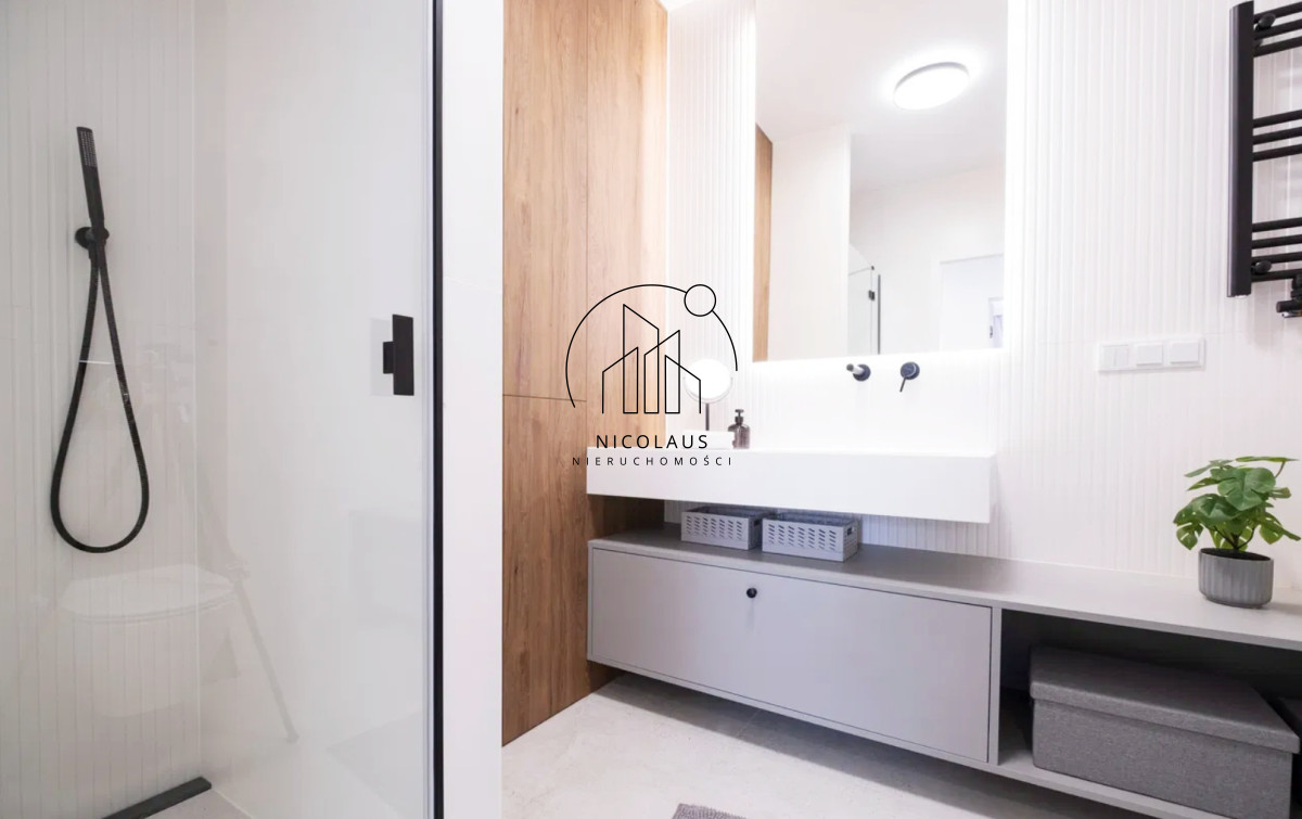 - nowoczesna łazienka z dużym prysznicem oraz miejscem na pralkę i praktyczne szafki